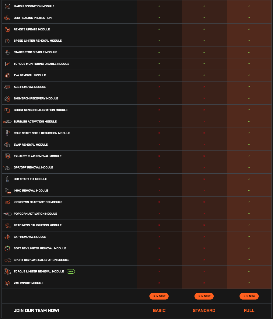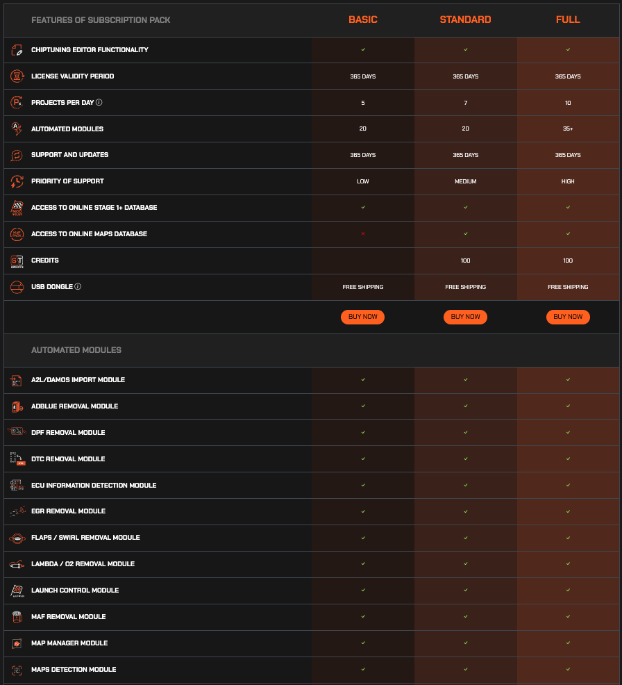 Τα διαθέσιμα modules σας επιτρέπουν να κάνετε αυτόματες μετατροπες στα αρχεία όπως DPF removal, DTC removal, AdBlue removal, Burbles Activation, Popcorn Activation, IMMO removal, Cold Start Noise Reduction, Hot Start Fix, Boost Sensor Calibration, Kickdown Deactivation, Sport Displays Calibration, Flaps removal, MAF removal, EGR removal, Lambda/O2 removal, Speed Limiter removal, όλα αυτά με το πάτημα ενός κουμπιού, κάνοντας τη δουλειά που ήταν προηγουμένως πολύ δύσκολη με μόνο ένα κλίκ